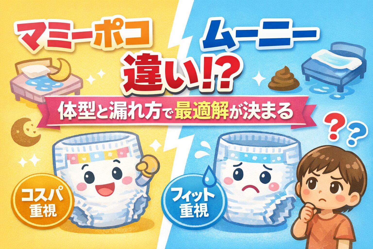 この記事では、マミーポコ ムーニー 違いを「体型×漏れ方」で整理し、夜漏れ・うんち漏れ・足回り漏れなど症状別に最適解をすぐ出せる判断軸をまとめます。
