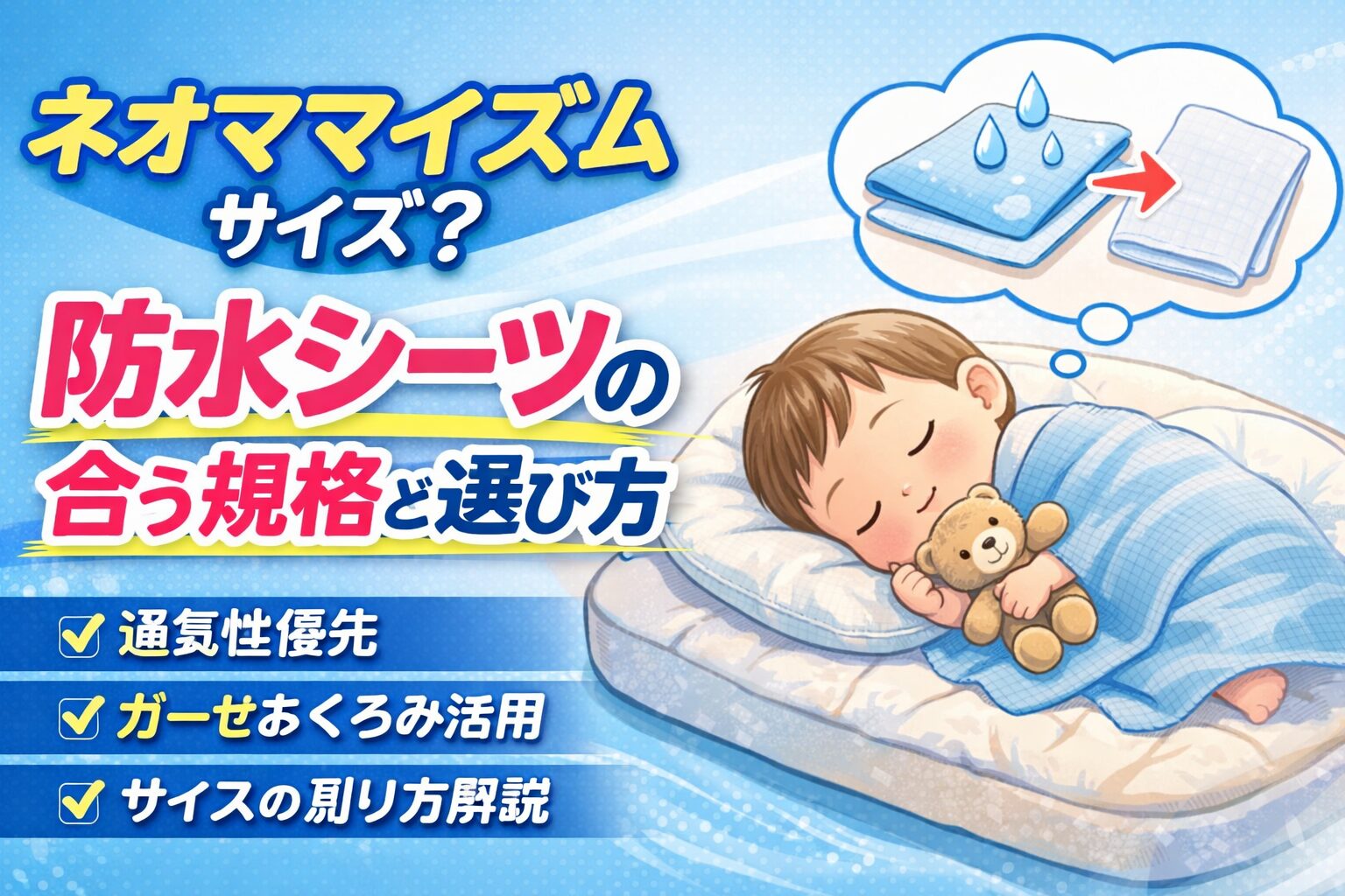 ネオママイズム サイズで防水シーツを選ぶなら、「ぴったり規格探し」より「通気を優先した運用」が結論です。