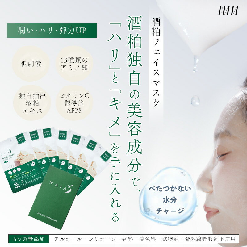 biasu【商品名】 NAIA 酒粕フェイスマスク (6つの無添加) (低刺激) (ベンリーゼシート)【内容量】 1枚入 (25mL)×5枚 【メーカー/ブランド】 株式会社NAIA 【商品概要】 日本酒独自の美容成分で「ハリ」と「キメ」を手に入れる ■乾燥して荒れた肌をもっちり潤い肌へ整えます 奥能登でとれた酒粕から抽出した酒粕エキスを使用 酒粕エキスに独自に含まれる美容成分と天然保湿因子(NMF)でお肌の保湿だけでなく、お肌のハリ・弾力をUPさせ、もっちり潤い肌へ導きます ■ベンリーゼ™シート使用し、肌への密着度UP ベンリーゼ™は、旭化成株式会社が生産する連続長繊維不織布ですコットンリンターを原料としており、保水性が高く、肌への密着度が高いのが特徴です ■能登産の主成分- 酒粕エキス(櫻田酒造&宗玄酒造) 酒粕エキス 日本四大杜氏である能登杜氏が醸す日本酒は糖度が高く、アミノ酸など天然保湿因子(NMF)を多く含んでいます ■酒粕を熟成し、保湿成分量を増加 我々はさらに低温で長期間熟成させることで、タンパク質を分解し、アミノ酸量を増やしたうえでエキス抽出をしており、角質の奥まで天然の保湿成分でお肌を保湿します ■主な成分 酒粕エキス(保湿成分)スーパーヒアルロン酸*1(保湿成分) セラミド*2(保湿成分) 3種のオーガニック成分*3 ビタミンC誘導体*4…