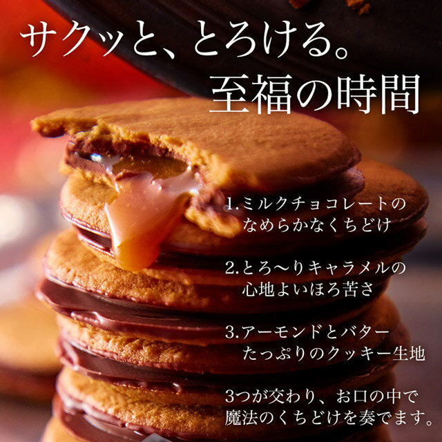 キャラメルとチョコレートの メルティな魔法スイーツ 「神戸魔法の」は神戸フランツの登録商標です。(第5875778号) ●そのまま お届け後そのままお召し上がりください。 商品名神戸魔法の®キャラメルサンドアレルギー成分表焼菓子 :アーモンド 商品サイズ(1枚あたり)直径約52mm×高さ約10mm (箱)約縦125mm×横217mm×高さ50mm 賞味期限90日保存方法直射日光、高温多湿を避け冷暗所で保存内容量 6枚 原材料チョコレート(砂糖、ココアバター、カカオマス、全粉乳、脱脂粉乳、植物油脂)(国内製造)、小麦粉、キャラメルソース(乳等を主要原料とする食品、水飴、砂糖、ぶどう糖、黒糖、マルトース、クリーム、米飴、寒天加工品(粉飴、寒天))、バター、砂糖、アーモンドパウダー、卵白、キャラメルパウダー、アーモンド加工品(アーモンド、砂糖)、全卵、食塩/トレハロース、ソルビトール、乳化剤、香料、(一部に卵・乳成分・小麦・大豆・アーモンドを含む) 販売者フランツ株式会社 +SF 神戸市灘区六甲町1-6-16 登録商標 「神戸魔法の」は神戸フランツの登録商標です。(第5875778号)栄養成分表示1枚当り(推定値)熱量 104kcal たんぱく質 1.2g 脂質 6.1g 炭水化物 11.3g 食塩相当量 0.03g