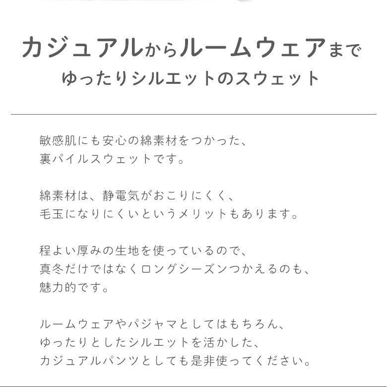 スウェットパンツレディースの紹介 ルームウェアからトレーニングウエア、またはラフなカジュアルウェアとしても使える、万能パンツと言えばスウェットパンツです。 最近はテレワーク着やリモートワーク着としても注目されています。 綿100%で肌触りが良く、しっかり厚手で暖かいのに、通気性に優れているので快適。送料無料なのでポイント消化にもおすすめです。 おすすめポイント ■綿100%(コットン100%)でふんわり柔らかい触り心地、肌着としても着られる。敏感肌で痒くなりやすい方にも安心して着て頂ける肌に優しい、かるい着心地のスウェットパンツ。 ■吸汗性、吸水性がいいので、スポーツウェアや体操着、運動着、作業着にもおすすめのコットンtシャツ。 ■ポリエステル100%よりも静電気が起きにくく毛玉もできにくい。 オススメコーディネート ストリート/きれいめ/ボーイッシュ/アメカジ/ノームコア/ナチュラル/トラッド/コンサバなどのスタイルと相性がいいです。 オーバーサイズ気味に着こなし、タイトでスキニーなボトムスを合わせてYラインを意識したコーデか、 またはタイト気味にサイズを選びIラインを意識したコーデがカッコいい。さらっと着られるレディーススウェットパンツでファッションを楽しもう! おすすめ着用シーン ■ルームウェアに 着心地のよい【スウェットパンツ】は家着、パジャマ、部屋着の定番ですしオーソドッ…