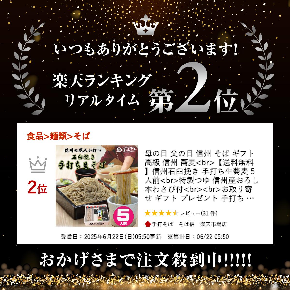 商品情報 名称 手打ち生そば 内容量 [そば]180g×5 [つゆ]80ml×5 原材料 [そば]そば粉(国内製造)、小麦粉(一部にそば,小麦を含む) [つゆ]醤油、削り節、昆布/調味料(アミノ酸等)(一部に大豆を含む) 保存方法 -18℃以下で保存 /冷蔵庫で解凍してから茹でて下さい 賞味期限 -18℃以下の保存で30日/解凍後は完全解凍後冷蔵庫で3日 製造者 有限会社そば信長野県長野市信州新町水内3585-2 備考欄 毎日店内の石臼で挽いた蕎麦粉を用いて、そば職人が手打ちをした信州の本格手打ち蕎麦の5人前 その蕎麦を高品質冷凍便技術を用いることで生そばでも長期保存が可能になりました。 お店で召し上がる香りや食感が落ちることなく、ご家庭で美味しい信州そばを堪能できます。 冷たいざるそばや温かいかけそばはもちろん、好きな天ぷらや薬味をのせてお召し上がりください。 国産の厳選した玄蕎麦を石臼挽きした蕎麦は風味がよく、贈答品やギフト、内祝い、お返しにもおススメです。 無料ギフトサービスや熨斗、ラッピング対応もおこなっております。 自家製の特製蕎麦つゆと安曇野本わさびがついたお得なセット内容をご賞味ください。 創業から30年以上、地元長野県長野市信州新町で蕎麦を今も打ち続け店内でも毎日提供しています。 地産地消 産直 蕎麦は様々なご用途でご利用いただけます 内祝・お返し・お祝い 出産内祝…