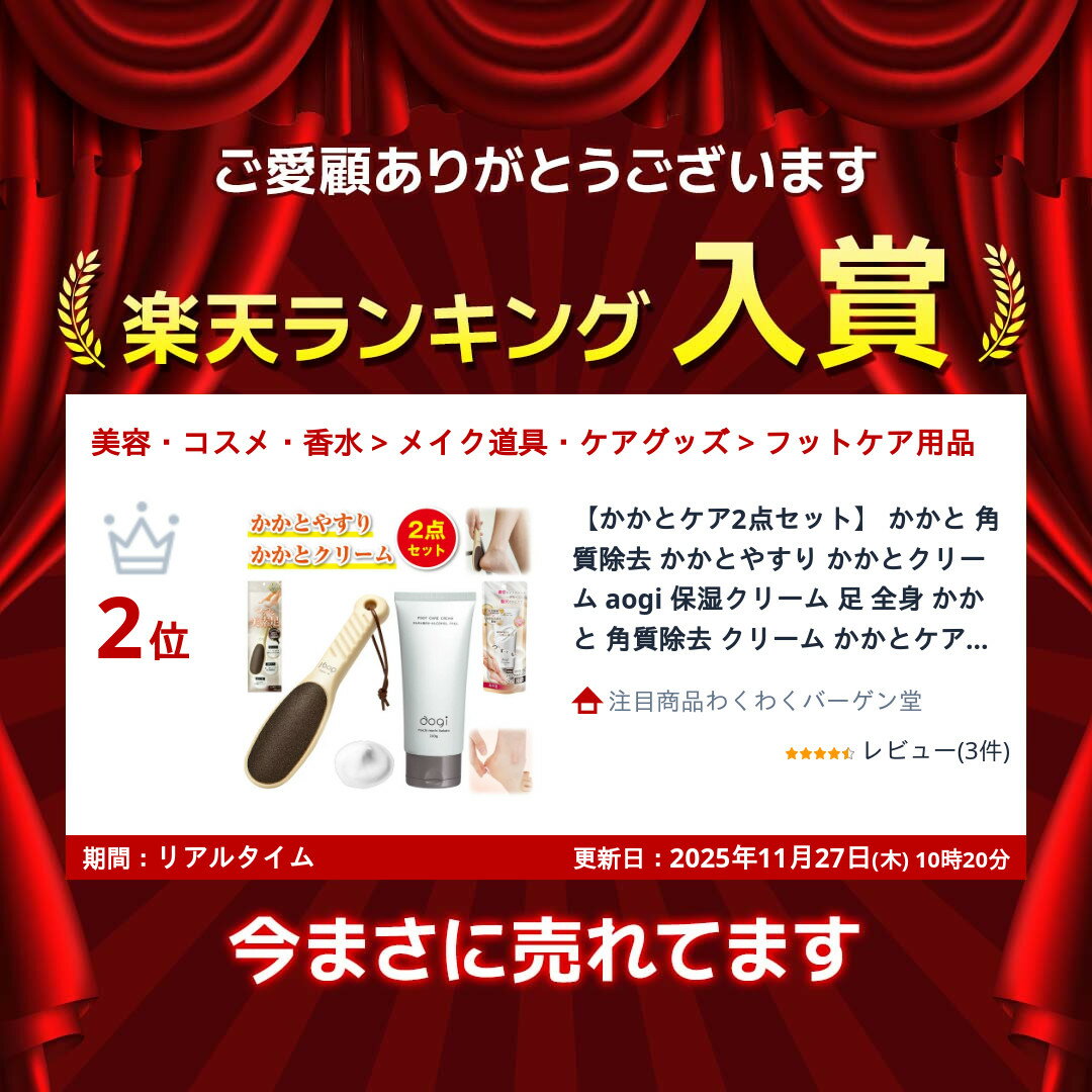 【★お得な2点セット★】 当ストアの単品価格で かかとやすり と かかとクリーム を別々に購入するよりもお安くなっております。 【シリーズ累計15万個達成*!サロンレベルのツルピカ素足に】 理想の削り具合と快適な使い心地を実現したフットケアサロン採用の両面仕様の かかとやすり & かかとクリーム の2点セットです。軽い力で効率的に角質を除去し、見せたくなるような「すべすべの美しい足」へ。 *2023年12月時点 【簡単2ステップ&水洗いOKで衛生的】 2種類の面を使い分けて誰でもサロンクオリティの仕上がりに。 かかとクリーム の併用で、より「すべすべモチモチかかと」へ導きます。 【足元専門ブランド aogi】 “フットコンディショニングブランド No1”を目指す関西発のブランドです。 ★この商品の詳しい活用方法についてはこちらの特集ページをお役立てください。 ★【足元から自信が輝く、トータルセルフケア。】フットケアサロンも推奨する「かかとやすり&クリーム」で、ガサガサかかとを滑らかに整えたら、次に気遣いたいのが「爪」です。巻き爪専門院監修のニッパー爪切りを使えば、硬い爪や巻き爪も簡単に、美しくカットできます。「かかと」と「爪」の両方を完璧にケアして、清潔感のある美しい足元を手に入れませんか? 関連キーワード : かかと 角質除去 かかとやすり かかとケア 削り かかとクリーム かか…