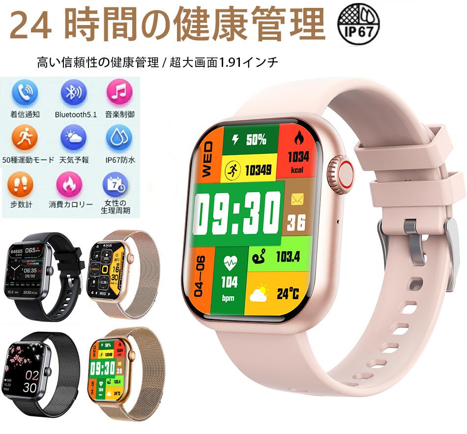 スマートウォッチ 日本製センサー 1.91インチ ブレスレット LINE Twitter SNS 睡眠モニター 音楽制御 日本語対応 誕生日 母の日 プレゼント iPhone/Android対応 通話腕時計 女性機能目覚まし時計 活動量計お贈り物プレゼントギフト