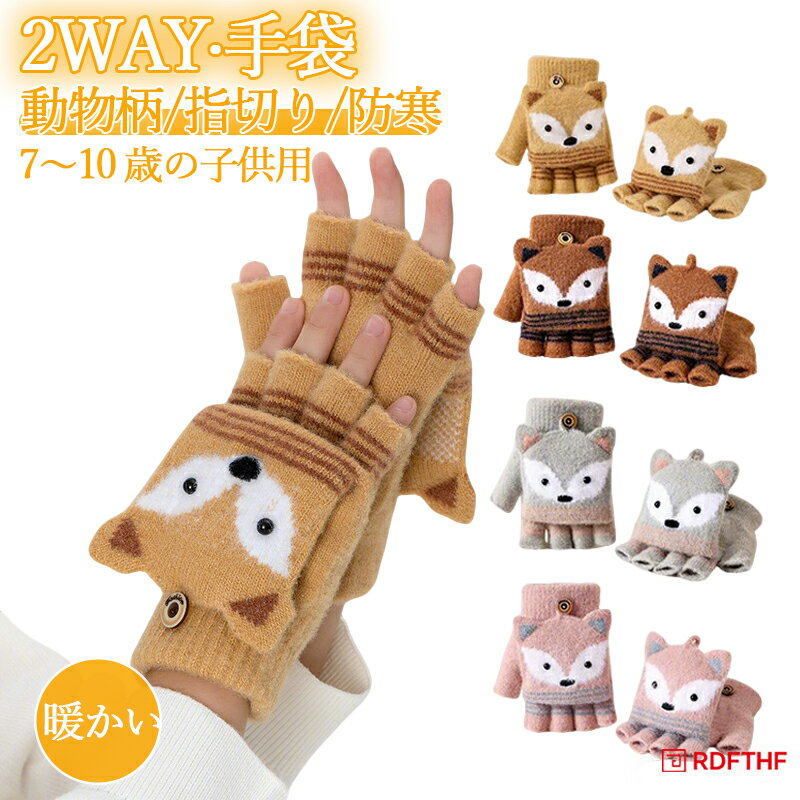 キッズ 手袋 女の子 暖かい 秋冬 防寒 子供手袋 動物柄 狐 かわいい ニット グローブ ジュニア 裏起毛 五本指 指切り ハーフ フィンガーカバー フード付き 2WAY 5-10歳 男の子 通園 雪遊び クリスマス プレゼント