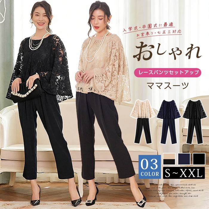 入学式 ママスーツ パンツスーツ レース セットアップ 入園式 卒園式 卒業式 お宮参り 七五三 ママ 母親 レディース フォーマル スーツ セレモニースーツ 白 黒 ネイビー カジュアル おしゃれ コーデ かっこいい