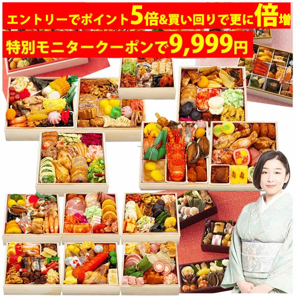 【特別モニタークーポン利用で9,999円&エントリーでポイント5倍+買い回りで倍増&最大300円引きクーポンあり!】平均17,217円相当の8種類おせちから抽選で1種をお届け 「おせち福袋」全国送料無料 年内到着可能 2025年9月500個販売!