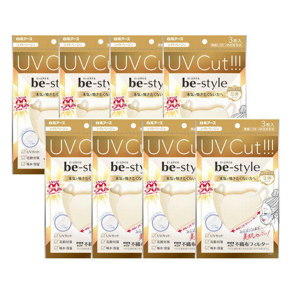 マスク 不織布 ビースタイル UVカットマスクライトベージュ3枚入×8個【8個セット】【ネコポス】 送料無料 白元アース 小顔 女性用 紫外線対策 夏用マスク