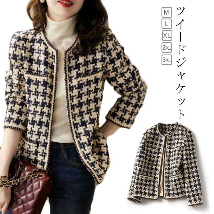 【激安販売中!】ツイード ジャケット レディース ノーカラー ジャケット 春 トップス フォーマル 羽織り ママスーツ おしゃれ シンプル きれいめ ツイード 裏地 体型カバー お出かけ 通勤 OL 女子会 オフィス オケージョン 入学式 秋 冬 長袖 アウター 無地