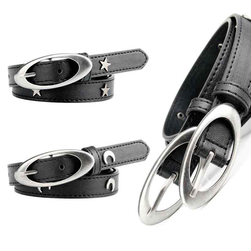 ベルト レディース 女性向け パンク ロック スタイリッシュ 個性的 クレセントムーン 三日月 リベット スタッズ アンティークシルバー 星飾り 万能 ジーンズ デニム カジュアル 合皮 フェイクレザー ストリートファッション