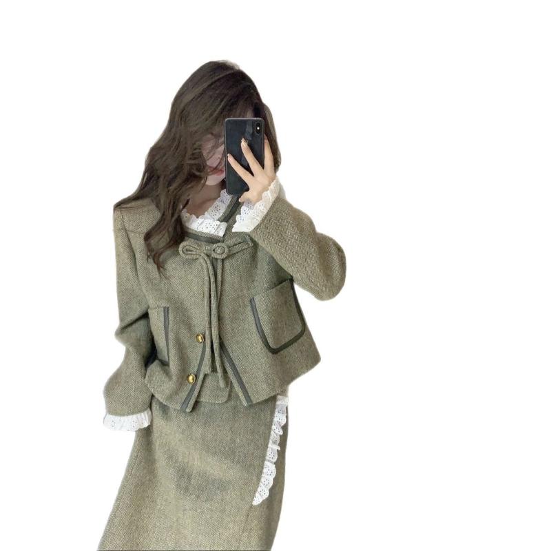 セットアップ レディース 秋 スーツ 2点セット ノーカラージャケット ミニスカート シャギーニット 卒業式 入学式 フォーマル エレガント かわいい 緑 グリーン系