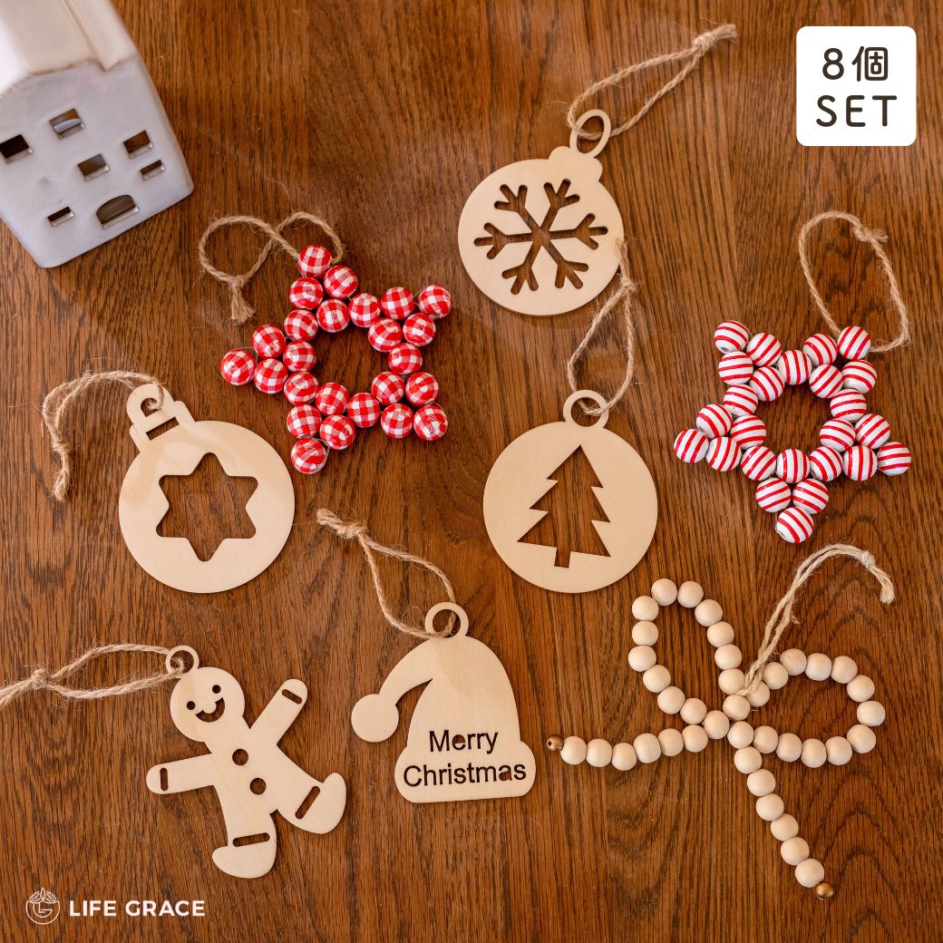 SS限定価格 クリスマス オーナメント 8個セット オーナメントセット クリスマスツリー ツリー ガーランド ウッドプレート セット 木製 木 ウッド 紐付き 麻紐付き 紐 デコレーション 飾り 飾り付け 飾りつけ パーティー 雪 結晶 雪の結晶 ベージュ レッド 赤 チェック