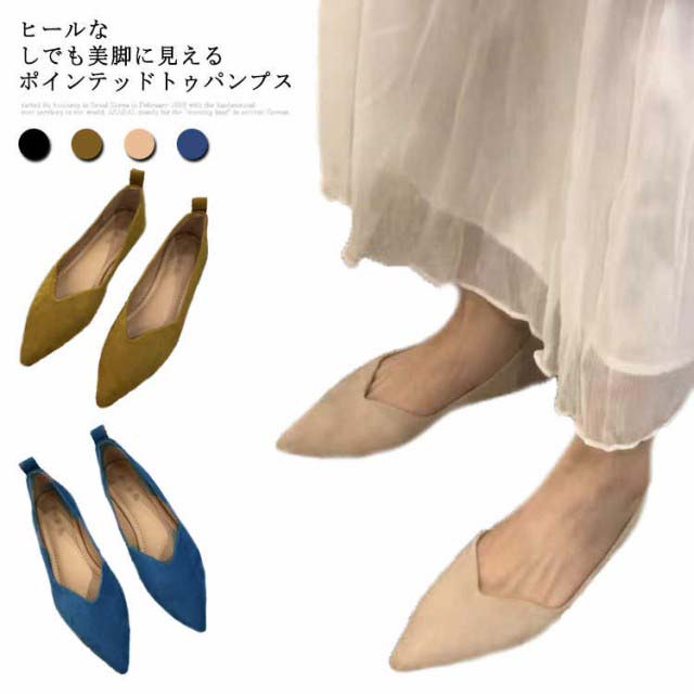 フラット ポインテッドトゥ レディース 通勤 オフィス 春夏 痛くない ローヒール パンプス ぺたんこ フラット Vカット 柔らかい 仕事 シューズ 甲浅 靴 シンプル スエード 走れる 美脚 ブラック 歩きやすい