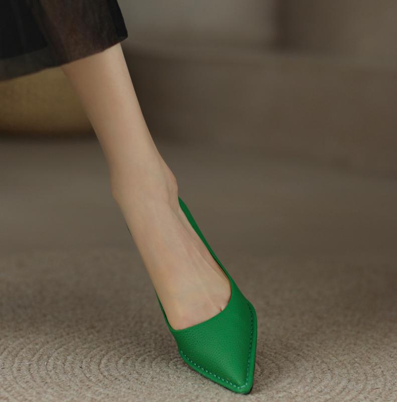 靴 レディース 小さいサイズ グリーン ローヒール パンプス ポインテッドトゥ チャンキーヒール 歩きやすい 履きやすい 滑り止め付き フェミニン かわいい カジュアル