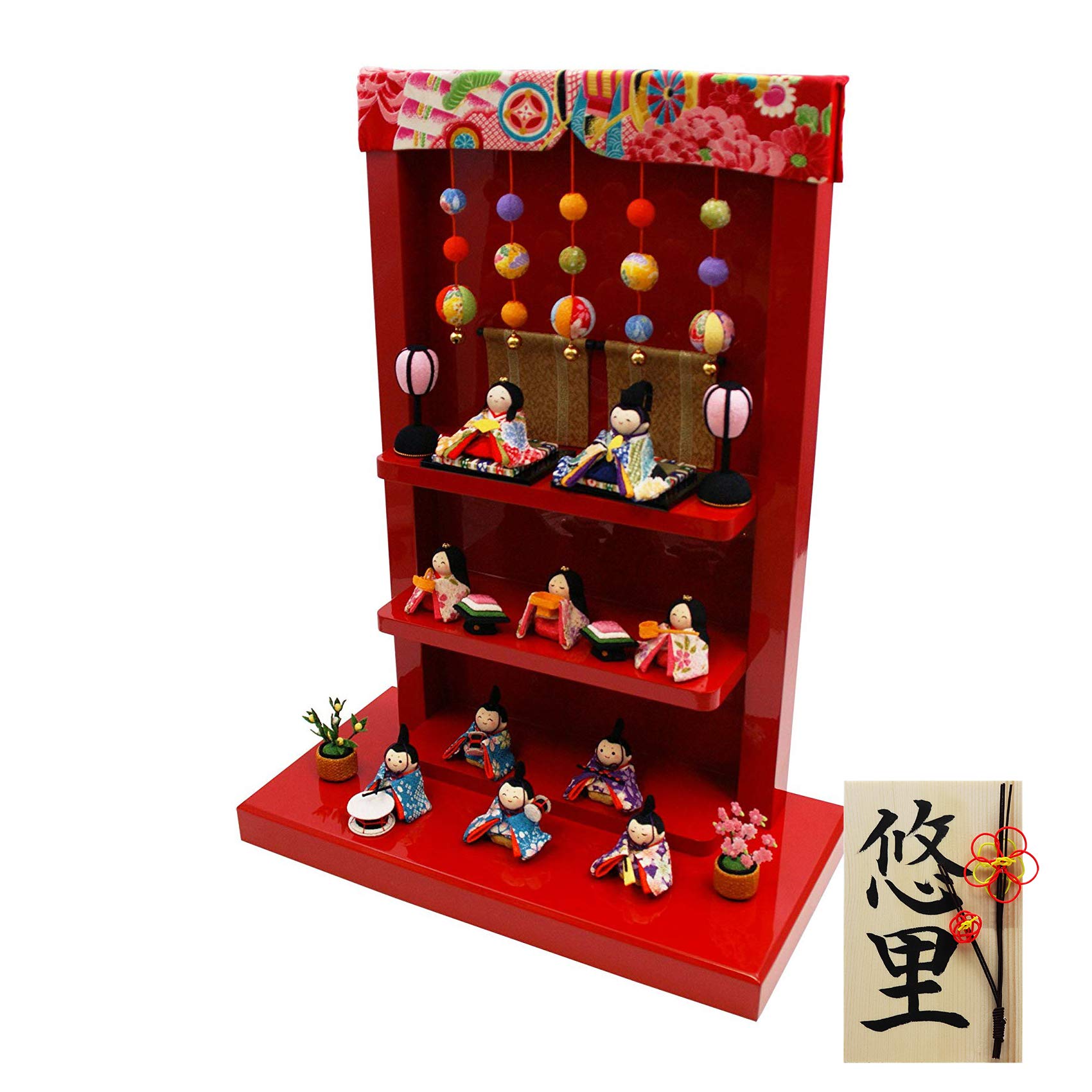 大阪長生堂 雛人形 コンパクト ミニ お雛様 名入れ 木札特典付(別送) ちりめん ひな人形 横幅36cm つるし飾り台わらべ雛10人揃い