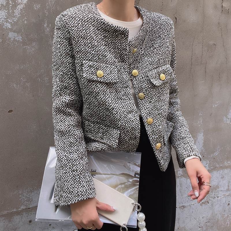 【P2倍&クーポン有】スリム ジャケット アウター レディース 個性的 秋 冬 ショート丈 長袖 萌袖 ラウンドネック 襟なし タイト 細身 ストレート ポケット 羽織り 前開き ボタン グレー 灰色 柄あり M L 厚手 オフィス パーティー 式典 イベント 旅行 レストラン