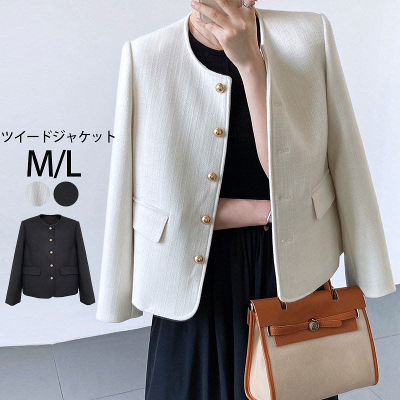 ツイードジャケット ジャケット レディース 春 秋 フォーマル ショート丈 ノーカラー アウター ママスーツ フォーマルジャケット ツイード 秋アウター 上品 エレガント 裏地付き ゴールドボタン 日常 デート パーティー オフィス お宮参り 結婚式 お食事会 通勤 白 黒