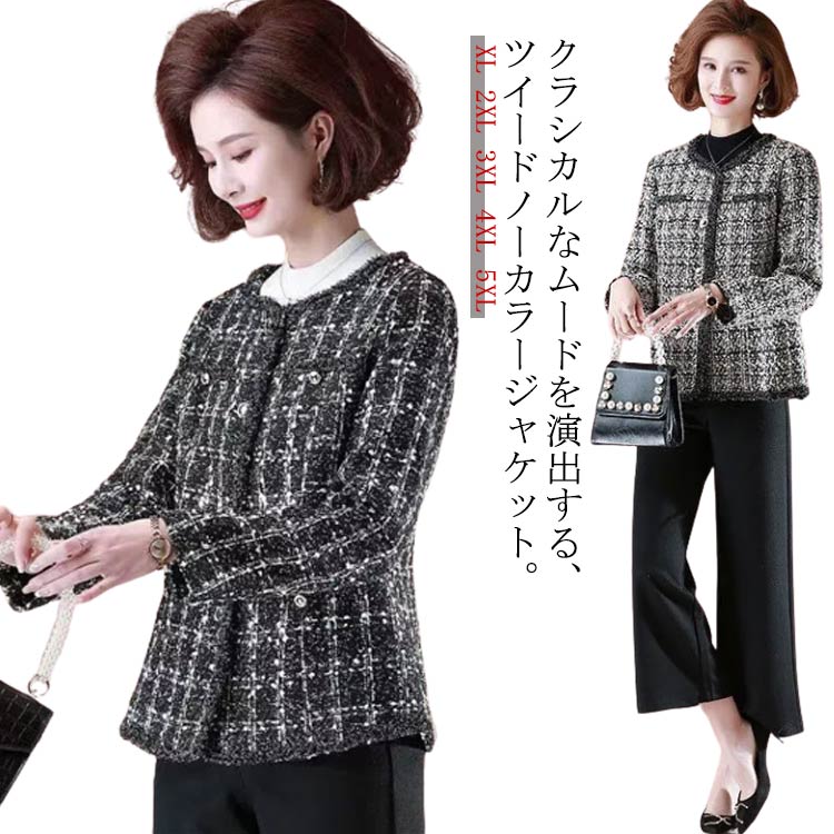 ツイードジャケット ノーカラ・ チェック 大きいサイズ ツイード ジャケット ノーカラージャケット アウター レディース きれいめ トップス ママスーツ フォーマル 卒業式 入学式 スーツ ママ ブラック ホワイト 白 黒 母 卒園式 入園式 長袖