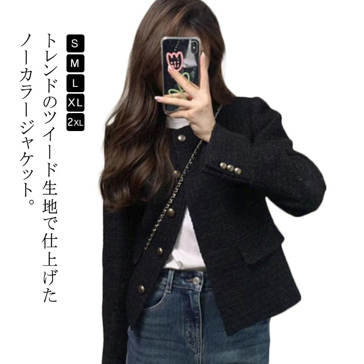 ノーカラージャケット ショート丈 レディース ノーカラージャケット 黒 ノーカラー ツイードジャケット 秋 春 アウター ツイード 長袖 ブルゾン フォーマル セレモニー ジャケット 大人 カジュアル オフィス 通勤
