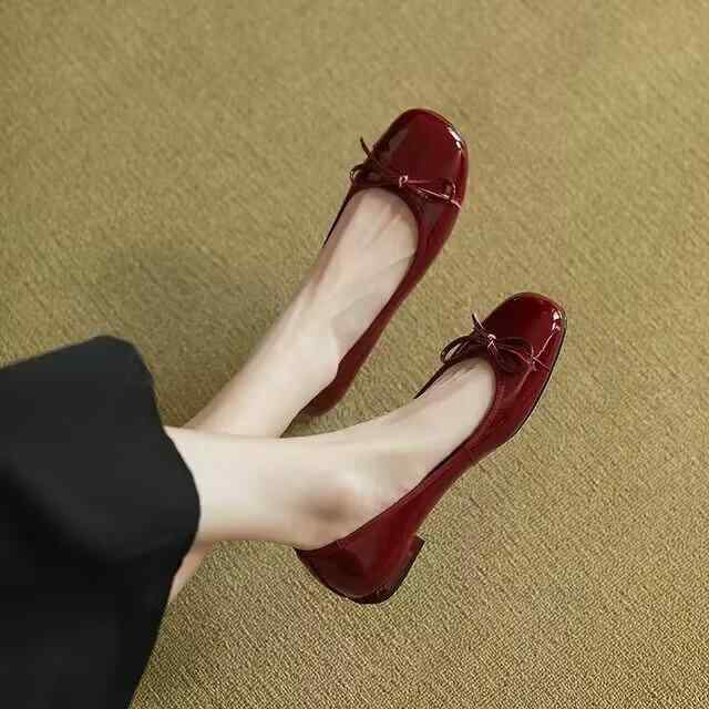 靴 レディース ローヒール パンプス バレエシューズ フラット スクエアトゥ リボン かわいい 歩きやすい 痛くない ぺたんこ 学生 エナメル調 春秋