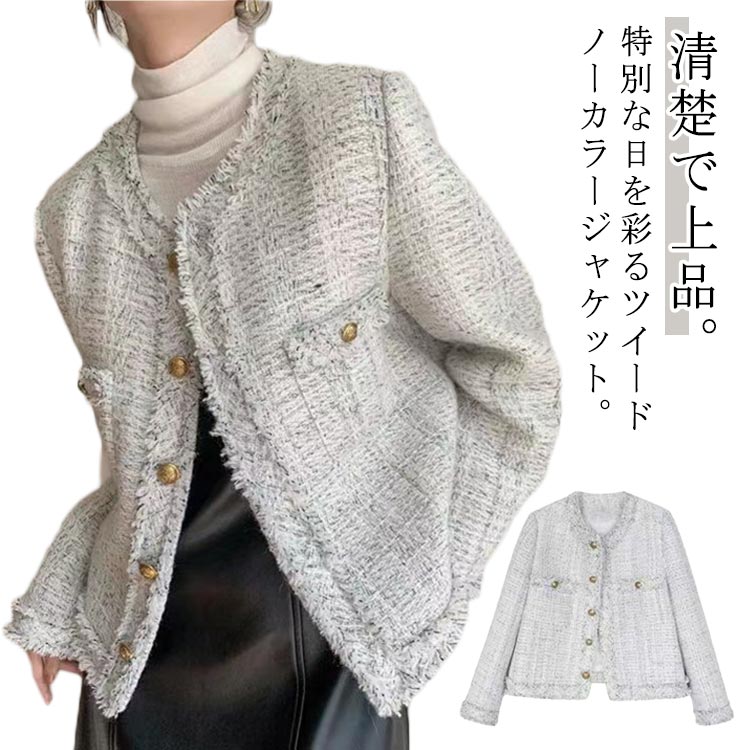 ツイード ノーカラージャケット レディース フリンジ ジャケット アウター 入学式 卒業式 入園式 卒園式 セレモニー ホワイト ノーカラー 羽織り オフィス 通勤 春秋 秋服 結婚式 フォーマル 上着 送料無料