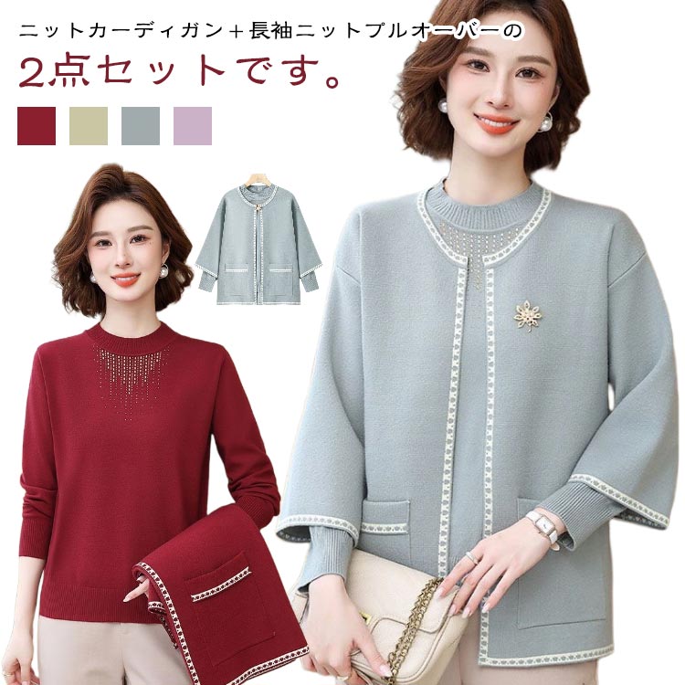 ニットカーディガン 60代 レディース 40代 50代 長袖 ニット ニットカーディガン クルーネック セーター ニットプルオーバー 婦人 2点セット 春 夏 秋 冬 ニットセーター ニットカーデ 羽織り ノーカラージャケット ミセス 母の日 敬老の日 ギフト プレゼント おしゃれ 秋服
