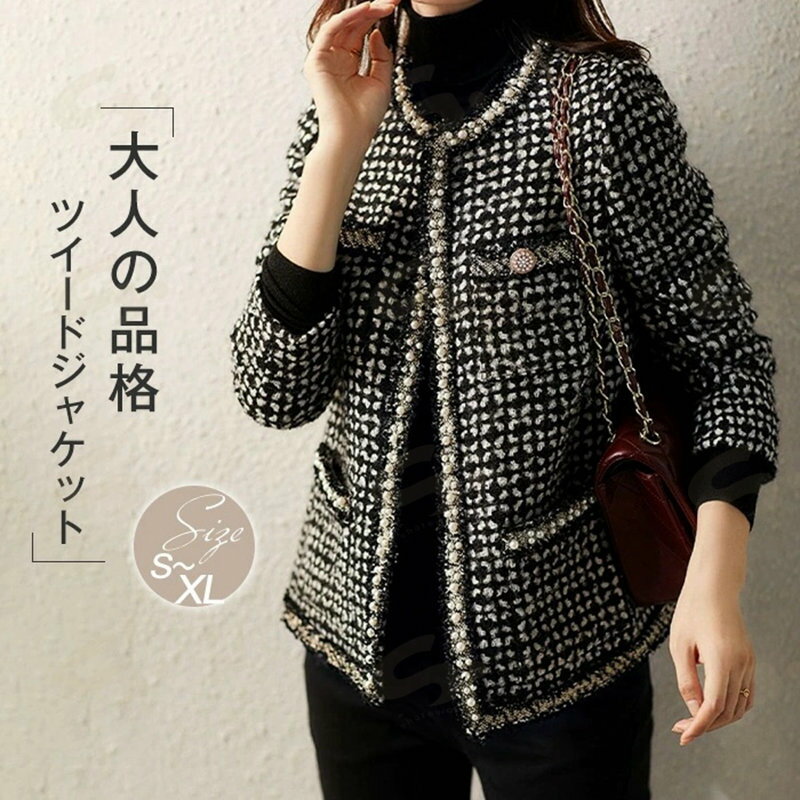 ツイード ジャケット レディース ノーカラー ジャケット 春秋 長袖 アウター チェック柄 パール付き トップス フォーマル 羽織り ママスーツ おしゃれ シンプル きれいめ 体型カバー お出かけ 通勤 女子会 オフィス オケージョン 入学式 卒業式 入園式 七五三 セレモニー