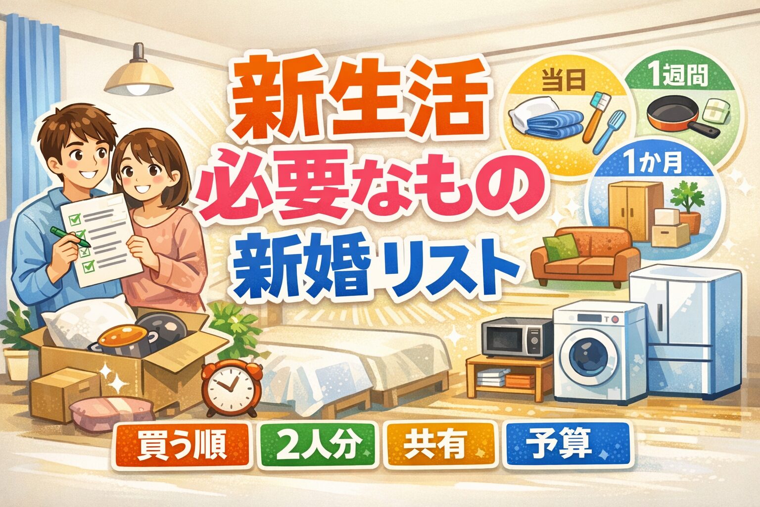 この記事では、買う順(当日〜1週間〜1か月)と部屋別チェックでの必要なもの一覧、二人暮らしの買う数の基準、家具家電の優先順位、予算を守る分け方までまとめて分かります。